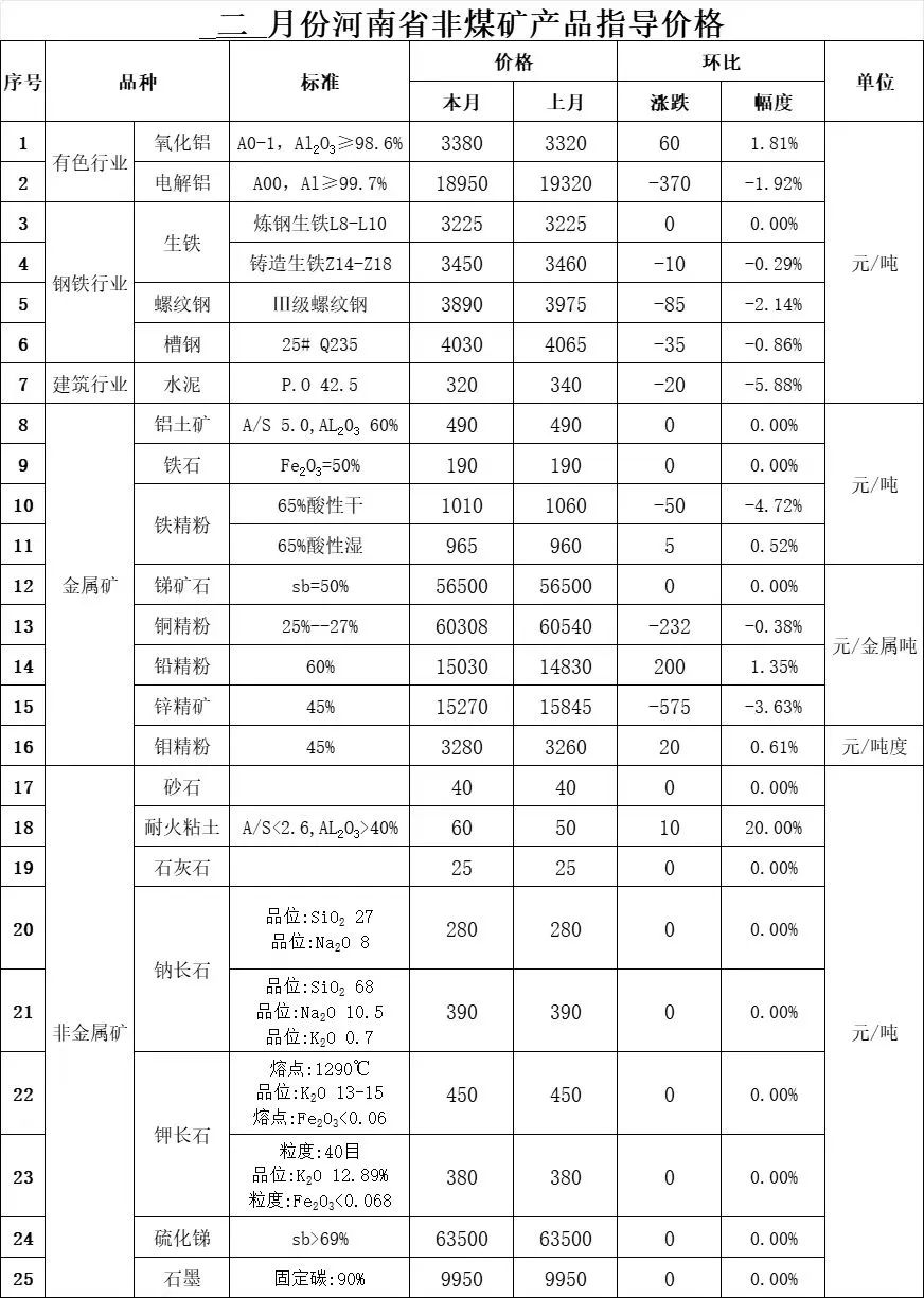 河南非煤二月份矿产品指导价格2024-02-24 -